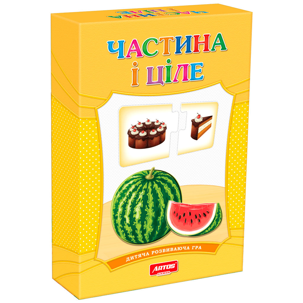 Настільна гра «Частина і ціле» представляє собою дидактичну мозаїку для дітей. В неї входить 27 картонних карточок, кожна з яких складається з двох елементів. На половинках зображені знайомі малюкам предмети, до яких потрібно підібрати пару із зображенням частин, що відповідають цим предметам.