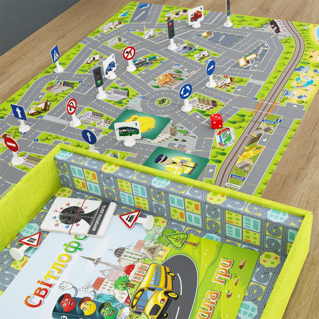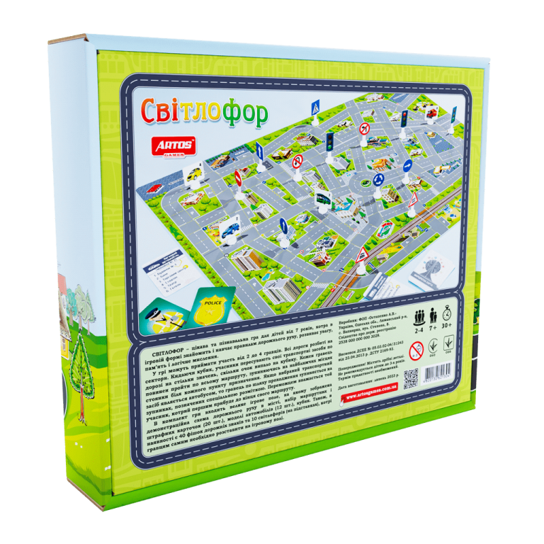 СВІТЛОФОР – цікава та пізнавальна гра для дітей від 7 років, котра в ігровій формі знайомить і навчає правилам дорожнього руху, розвиває увагу, пам’ять і логічне мислення.