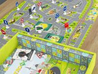В комплект гри входить велике ігрове поле, на якому зображена демонстраційна схема дорожнього руху в місті, набір маршрутних і штрафних карточок (20 шт.), моделі автомобілів (12 шт.), кубик. Також, в наявності є 40 фішок дорожніх знаків та 10 світлофорів (на підставках), котрі гравцям самим необхідно розставити на ігровому полі.